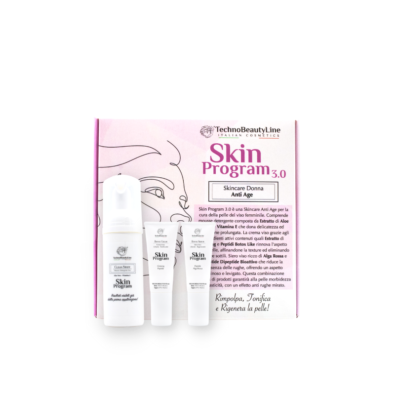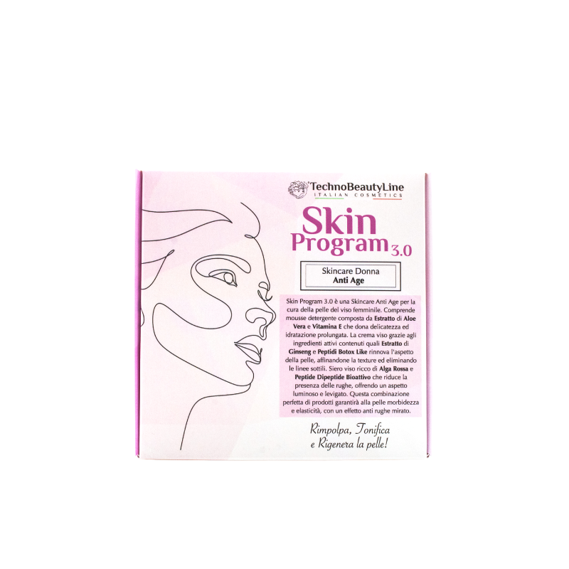 Skin Program 3.0 è una Skincare Anti Age per la cura della pelle del viso femminile. Comprende mousse detergente composta da Estratto di Aloe Vera e Vitamina E che dona delicatezza ed idratazione prolungata. La crema viso grazie agli ingredienti attivi contenuti quali Estratto di Ginseng e Peptidi Botox Like rinnova l’aspetto della pelle affinandone la texture ed eliminando le linee sottili. Siero viso ricco di Alga Rossa e Peptide Dipeptide Bioattivo che riduce la presenza delle rughe, offrendo un aspetto luminoso e levigato. Questa combinazione perfetta di prodotti garantirà alla pelle morbidezza e elasticità , con un effetto anti rughe mirato.