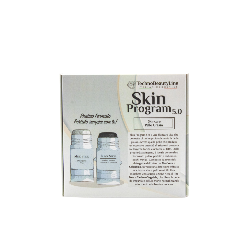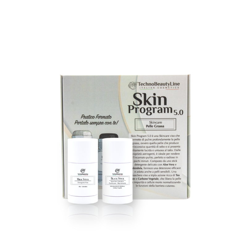 Skin Program 5.0 è una Skincare viso che permette di pulire profondamente la pelle grassa, ovvero quella pelle che produce un’eccessiva quantità di sebo e si presenta solitamente lucida e untuosa al tatto. Dalle proprietà astringenti, è ideale per rendere l’incarnato pulito, perfetto e radioso in pochi minuti. Composto da uno stick detergente delicato con Aloe Vera e Calendula, fornisce una detersione efficace e adatta anche a pelli sensibili. Una maschera viso a tripla azione ricca di Tea Tree e Carbone Vegetale, che libera la pelle da impurità e cellule morte normalizzando le funzioni della barriera cutanea.