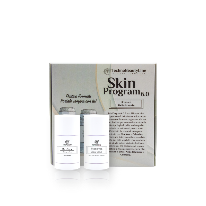 Skin Program 6.0 è una Skincare Viso che permette di rivitalizzare e donare un aspetto sano, luminoso e giovane alla tua pelle. Studiata per essere effiace a tutte le età e tipologie di pelle, anche quelle rovinate da trattamenti, sole o acne. Composto da uno stick detergente delicato con Aloe Vera e Calendula, fornisce una detersione efficace e adatta anche per pelli sensibili. Una maschera viso ad alto potere idratante, lenitivo e rigenerante, che conferisce al viso un aspetto più fresco e radioso, grazie alla presenza di Zinco, Acido Ialuronico e Calendula.